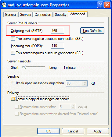Step 5: Once in the Advanced tab of the Account Settings dialog, change the Outgoing mail (SMTP) field setting from the default setting of 25, to 465