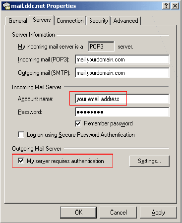 Step 3: The properties dialog box for your account will now open. Select the Servers tab (shown in red box).