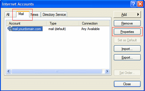 Step 2: The Internet Accounts dialog box will open. Click on the Mail tab (shown in red box in the upper left hand corner) then select your mail account (in this example it is listed as mail.yourdomain.com). Now click on the properties button (shown in red box on the right).
